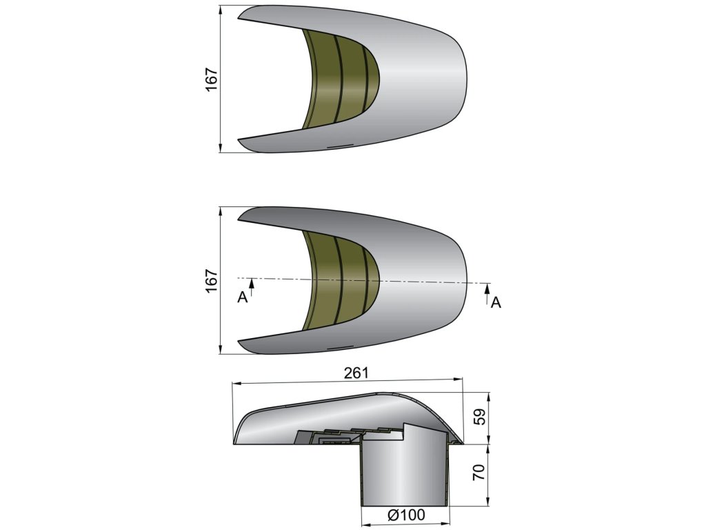 Vnější kryt je vyroben z vysoce lesklé leštěné nerezové oceli. Plastická základna je standardně dodávaná kompletně se zabráněním vniku vody a hadicovým nástavcem pro hadici o průměru 100 mm. Kompletně může být montována horizontálně nebo vertikálně. Ideální použití je k odvětrávání motorového prostoru. Větraný průduch 41 cm2.